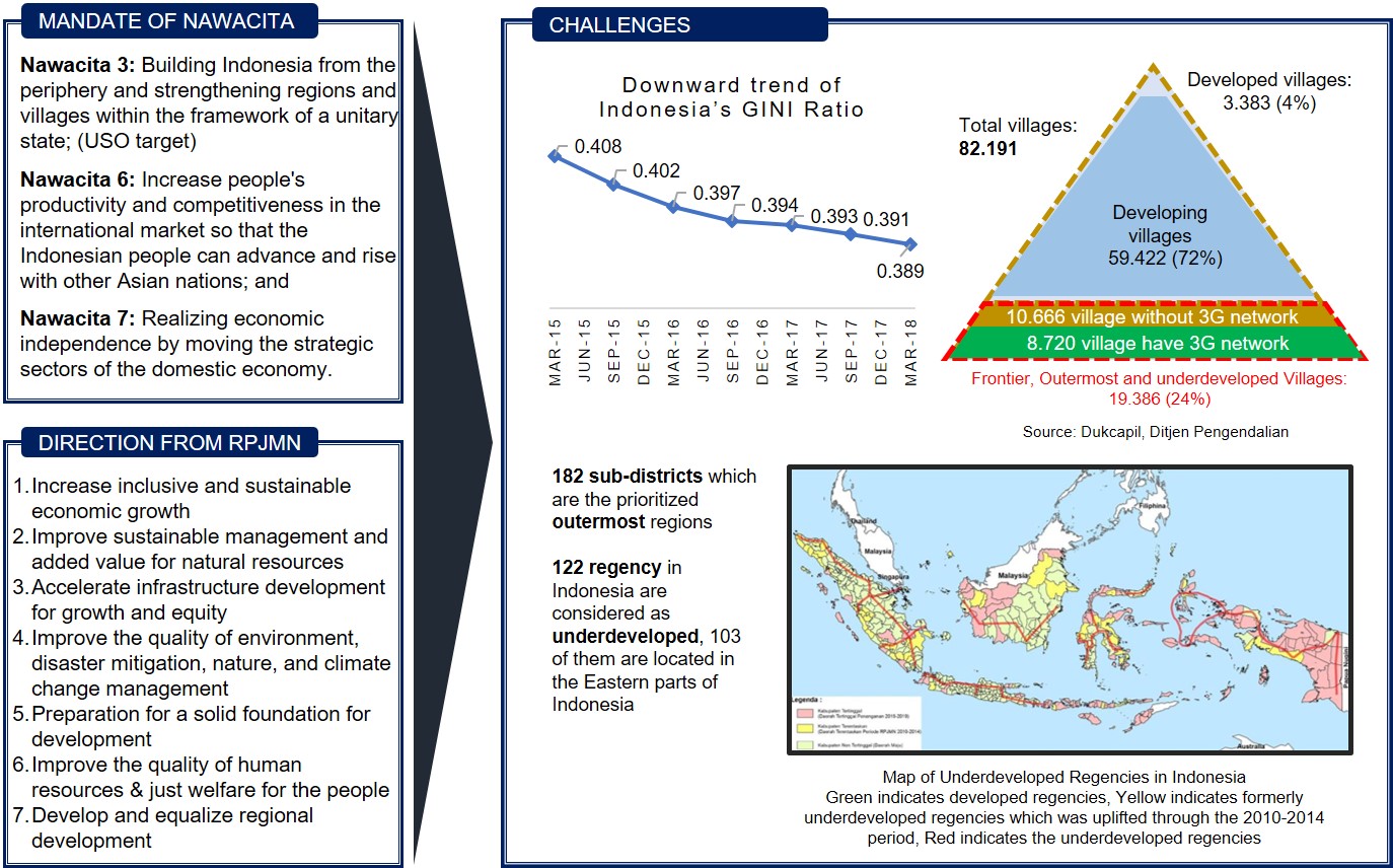 The development of frontier and outermost regions can be a blind spot for many governments, including Indonesia. The Indonesian Central Bureau of Statistics reports that in March 2018, Indonesia's GINI Ratio reached 0.382. This problem is even more critical in areas bordering other more developed countries where the difference is very starkly visible, sowing  the seeds for social unrest and threatening national security. Therefore the development of the frontier, outermost, and underdeveloped (3T) regions must be a major concern for national development.