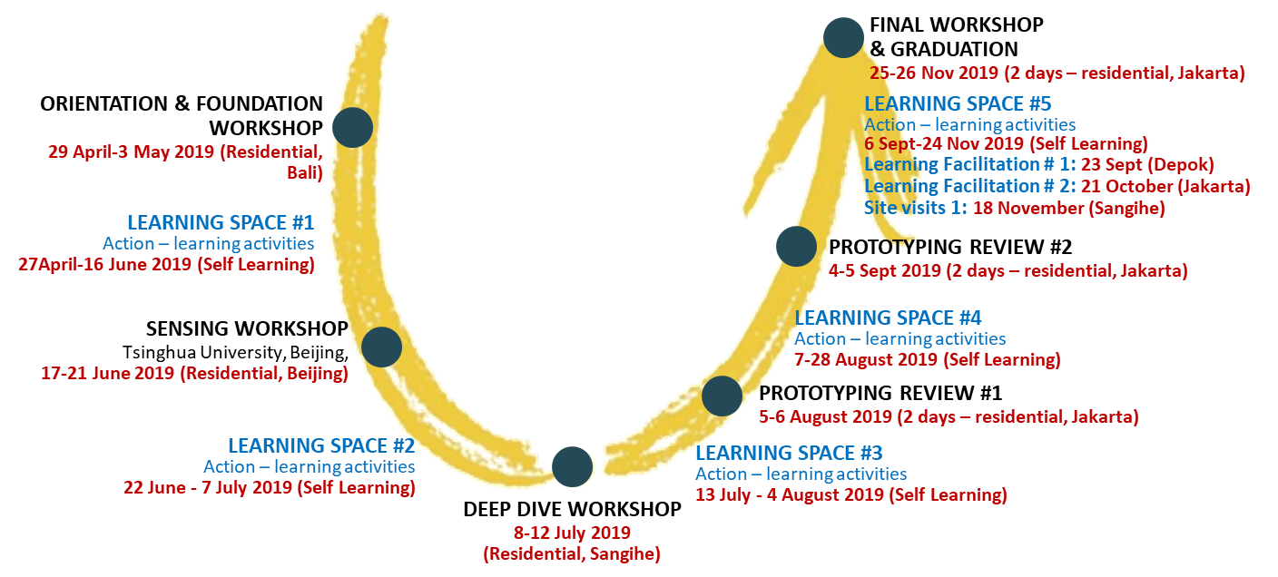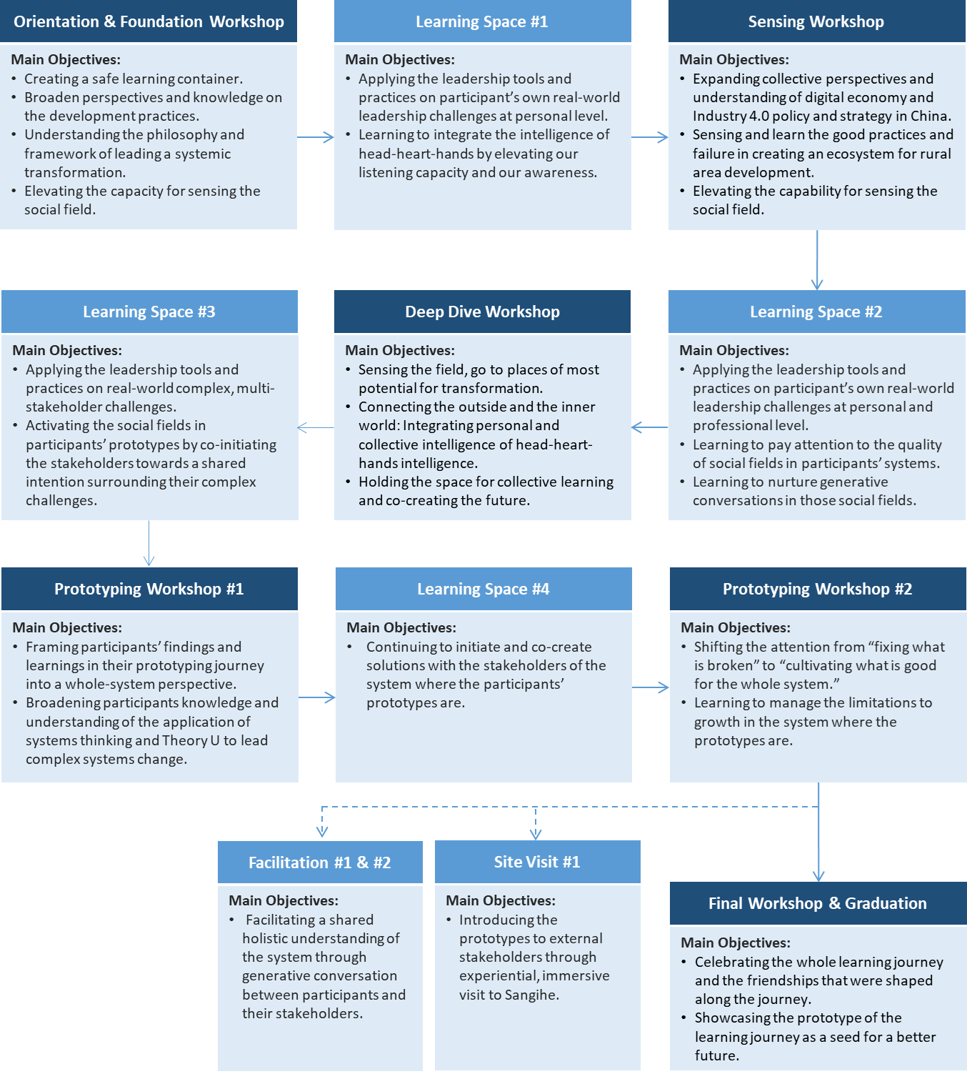 Leaning towards education that focuses on learning instead of teaching, and drawing from decades of combined institutional and personal experiences of facilitating complex systems transformation, we translate the two philosophical-methodological underpinning of Theory U and The Fifth Discipline into a program design based on andragogical principles for adult learning. The milestones of the learning journey are below outlined.