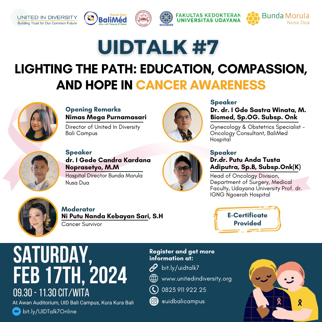 To commemorate World Cancer Day which falls in February, or more precisely February 4, United In Diversity in collaboration with the Cancer Care Student Community (KOMPAK), Balimed Hospital, Udayana University Faculty of Medicine, and Bunda Morula Nusa Dua held a talk show, inviting doctors who are experts in their fields, with the theme "Lighting the Path: Education, Compassion, and Hope in Cancer Awareness".