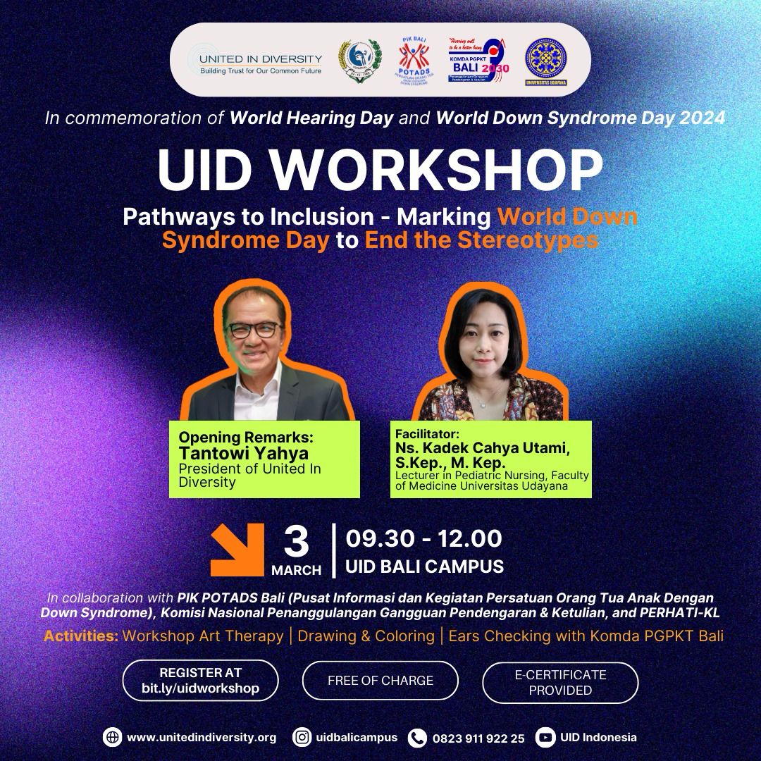 Make a difference in the lives of others! Join UID Bali Campus for a workshop titled "Pathways to Inclusion - Ending Stereotypes" to mark World Syndrome Day and World Hearing Day.